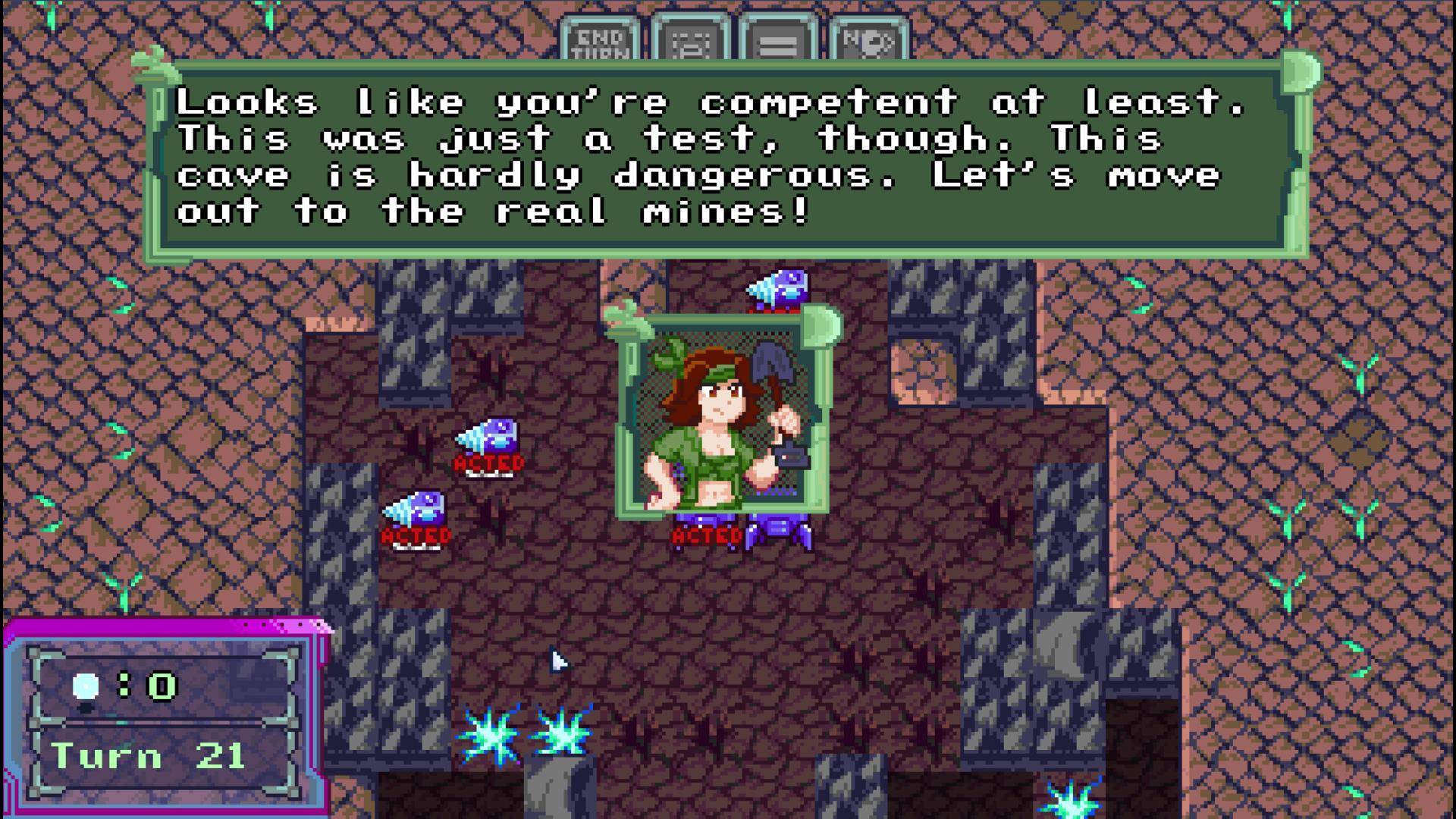 –Robocop callback! Katja’s Abyss: Tactics features robotic mining equipment creeping around a subterranean cavern while using a turn-based active points system to move, act, and respond.